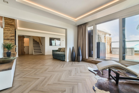 The kitchen is equipped with a black composite countertop with an integrated sink, a 5-burner gas hob with extractor hood above, a fridge-freezer combination, oven, microwave, and dishwasher, plus space for a large dining table, an inviting spot for enjoyable days and evenings with family or friends, where the chef’s cooking skills can truly shine.